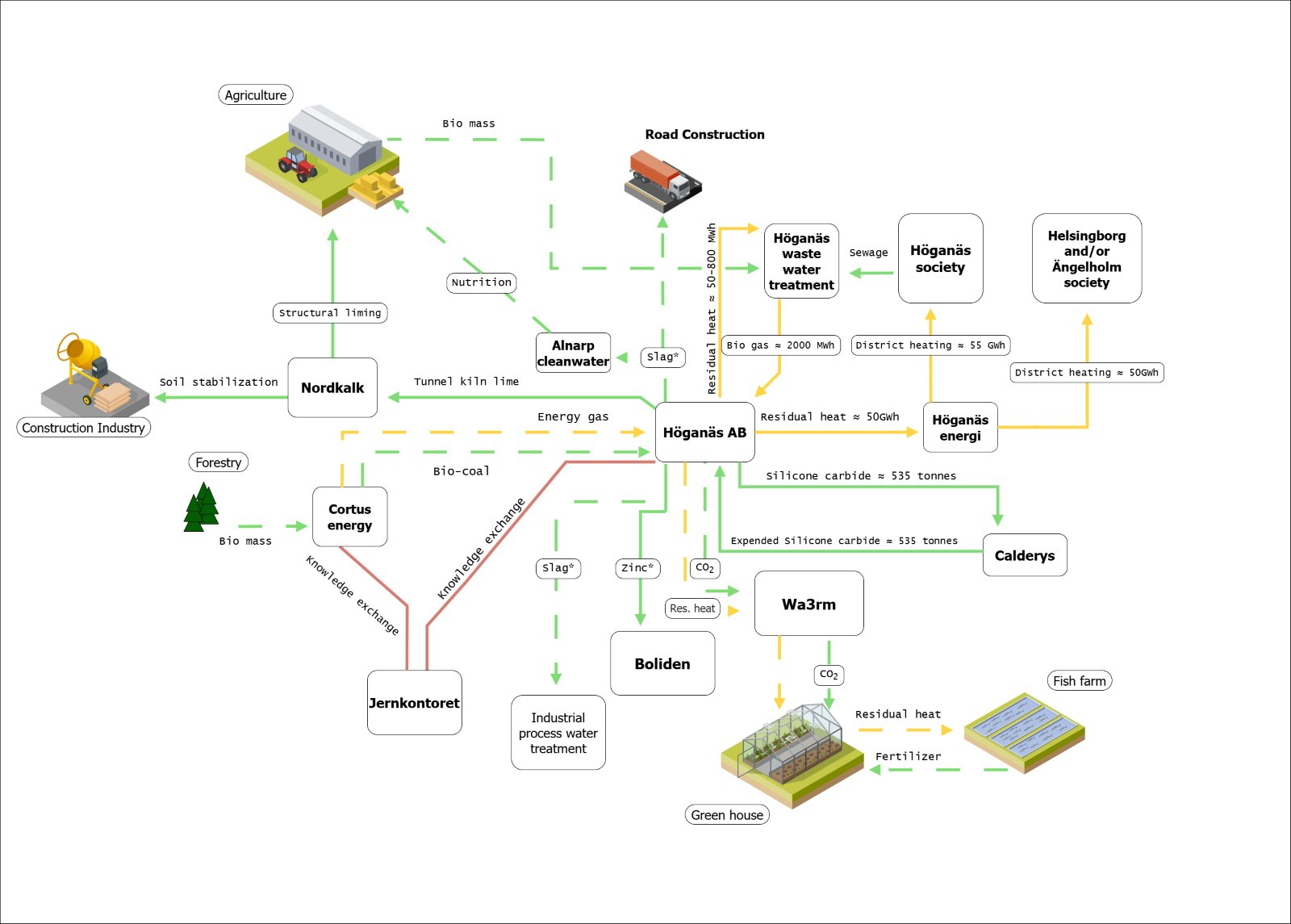 Höganäs är en kommun på den skånska västkusten och hem till Höganäs AB, den äldsta processindustrin i området. Idag producerar företaget metallpulver som genererar flera biprodukter och sidoströmmar vilket ger potential åt både energi- och materialsamarbeten. Genom åren har företaget skapat flertalet resurs- och biproduktutbyten, bland annat med Höganäs kommun. Den senaste utvecklingen av symbiotiska möjligheter är ett samarbete med livsmedelsindustri genom företaget Wa3rm som agerar som förmedlare inom olika energi- och resursutbyten. Det kan vara värdefullt att ha med en drivande förmedlare som kan initiera nya samarbeten mellan andra aktörer när kunskapen, resurserna eller kontakterna inte finns tillgängliga. En annan viktig aktör för nätverket är Höganäs kommun, som har en god förståelse för samarbetena mellan lokala och regionala aktörer. Kommunen har även två viktiga företag involverade i det existerande nätverket, Höganäs Energi och det kommunägda avloppsreningsverket.